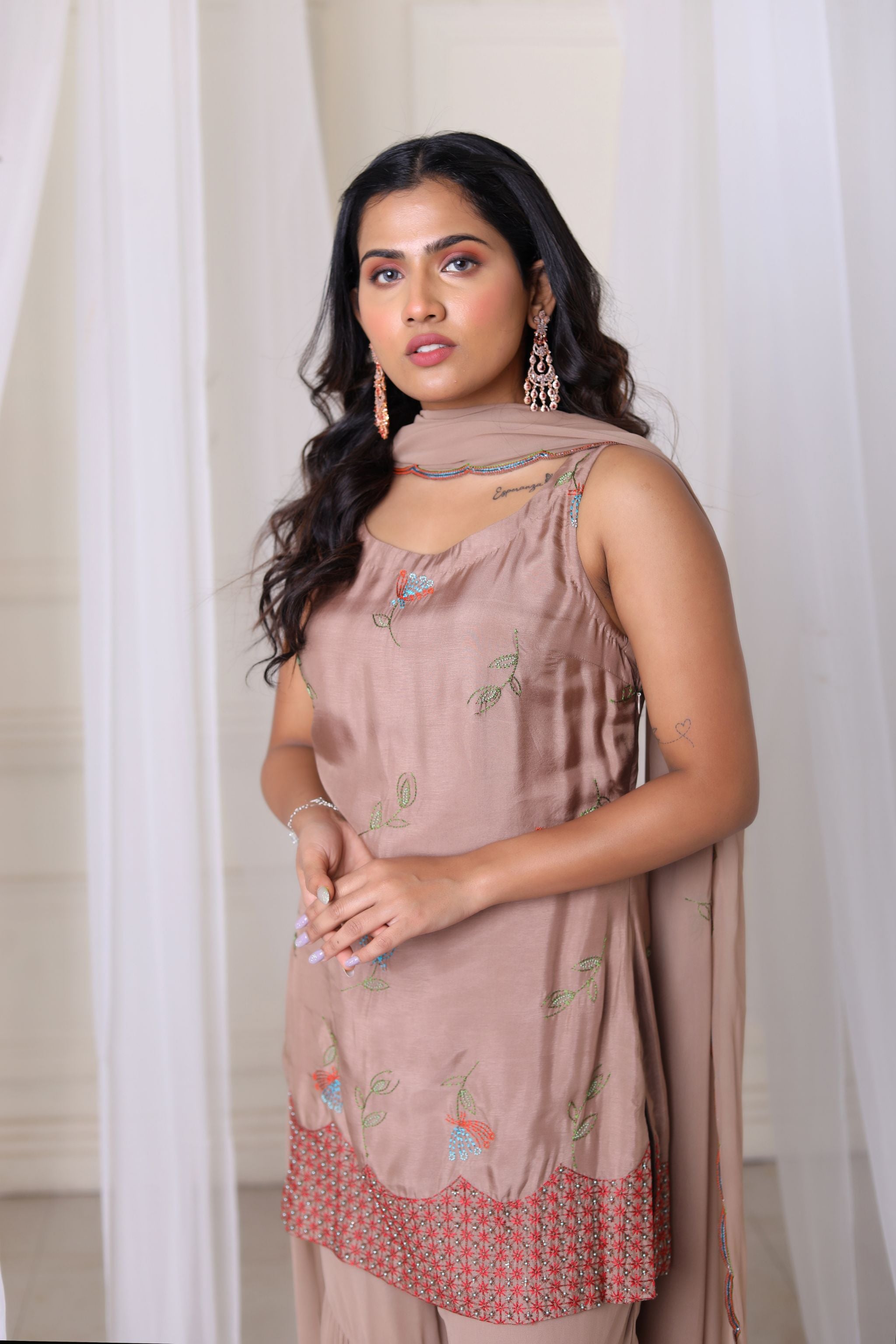 Add a graceful touch to your wardrobe with this stunning Sharara set. The elegant silk kurta features intricate hand embroidery, paired perfectly with flowing georgette sharara pants and a soft georgette dupatta. The delicate craftsmanship and earthy brown tone make it ideal for festive occasions, celebrations, or intimate gatherings.