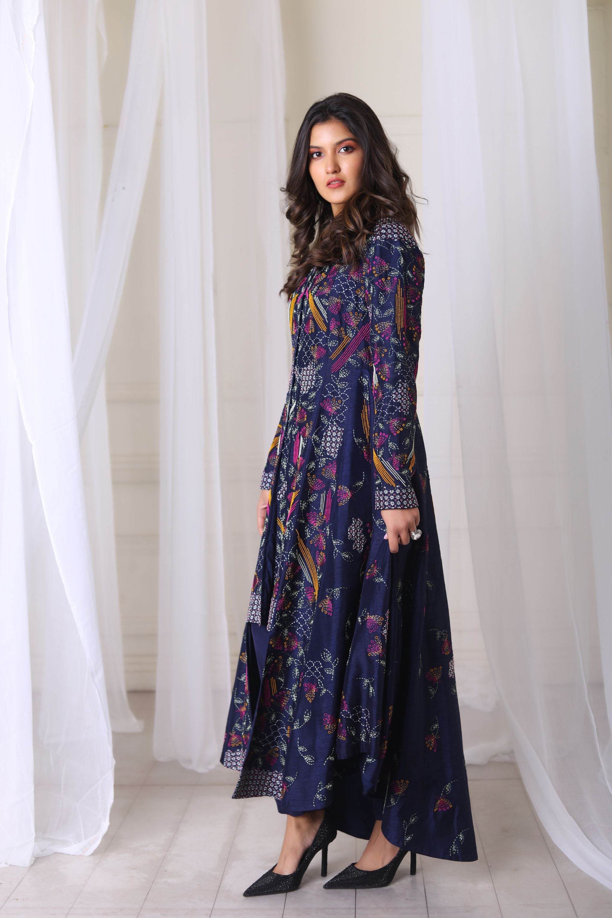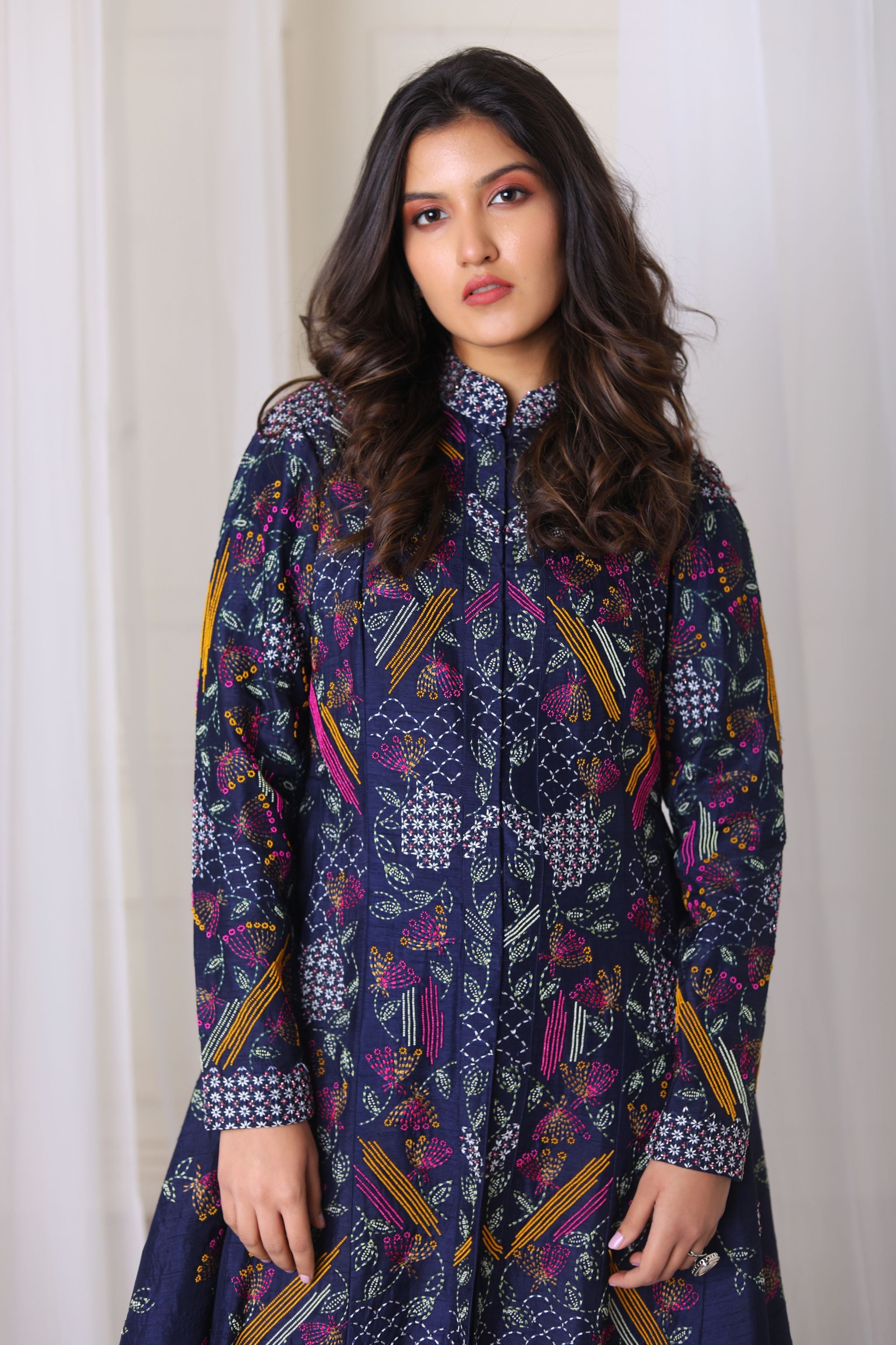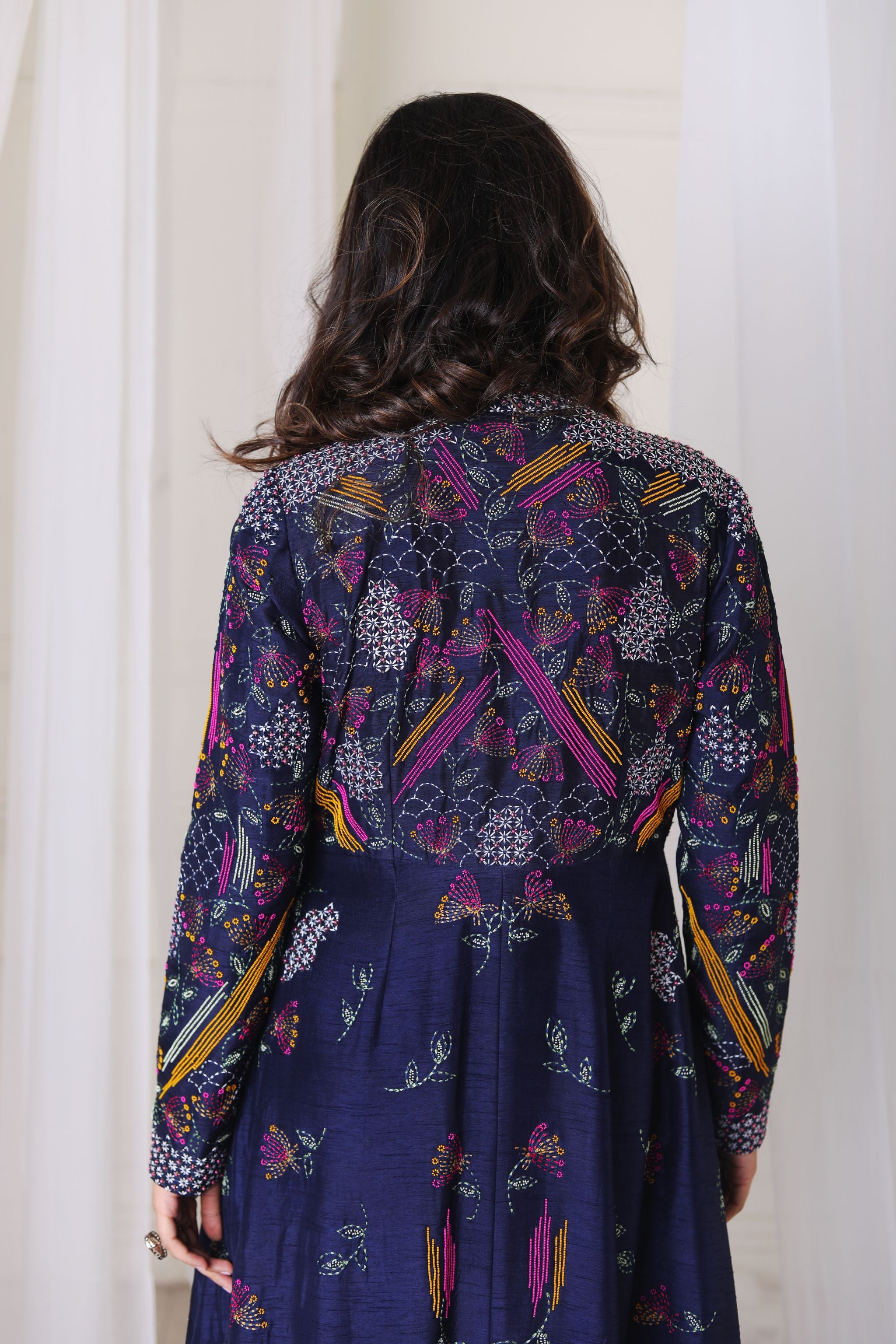 Home Hand Embroidered Navy Blue Kalidar Kurta With Drape Pant