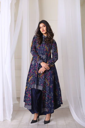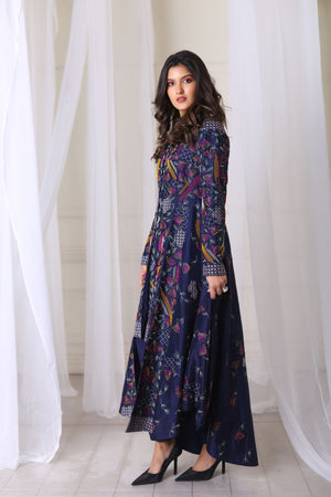 Embrace the charm of this exquisitely handcrafted Kalidar Kurta Set in navy blue, featuring a long silk kalidar kurta paired with crepe pants. Designed with intricate hand embroidery, this set effortlessly blends tradition with modern aesthetics, making it perfect for special occasions or evening gatherings.