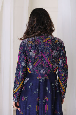 Hand Embroidered Navy Blue Kalidar Kurta With Drape Pant