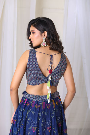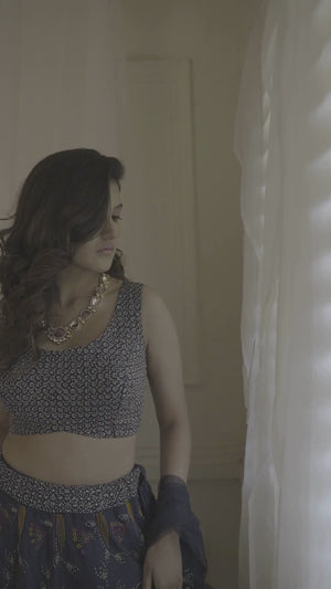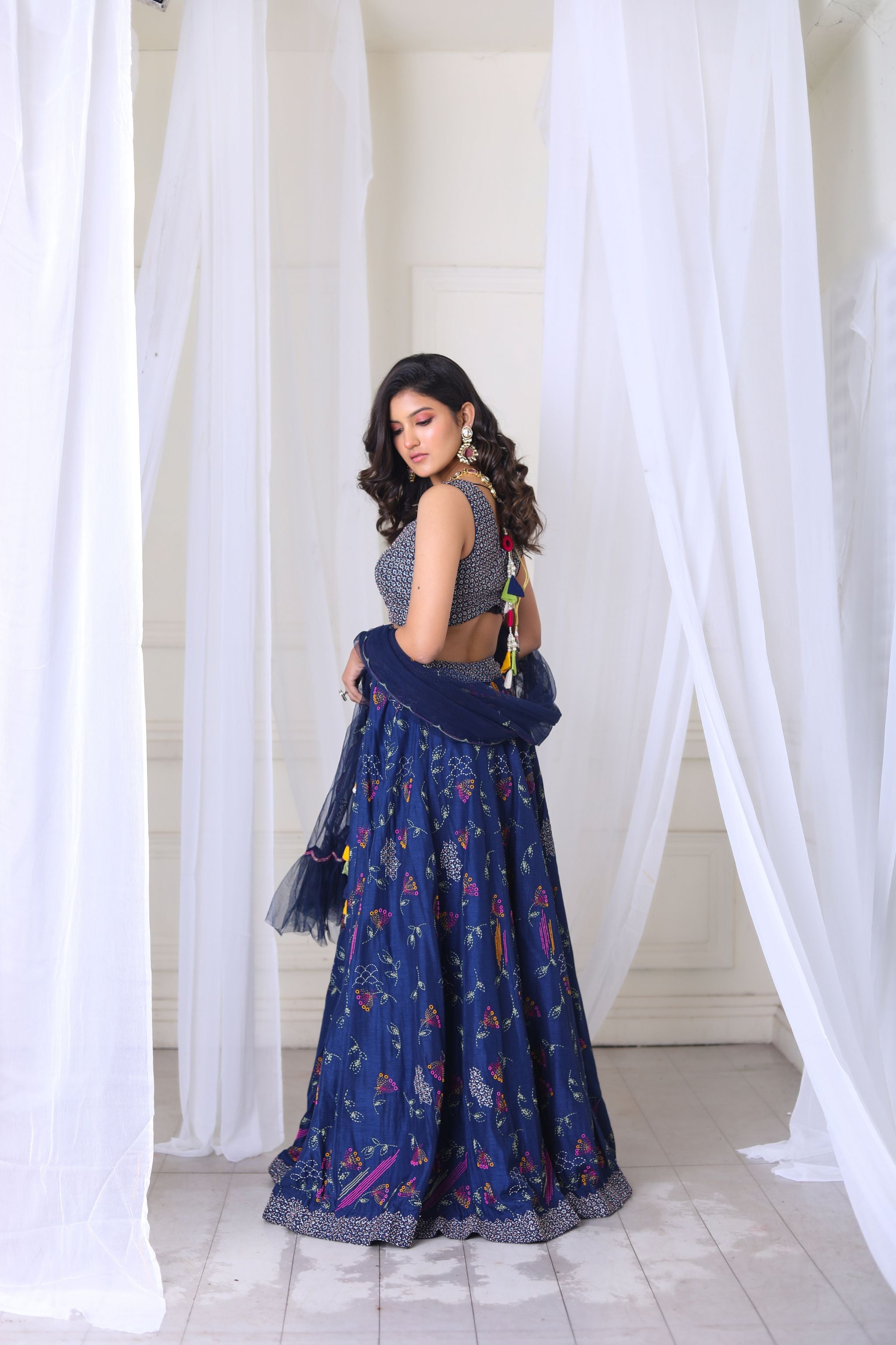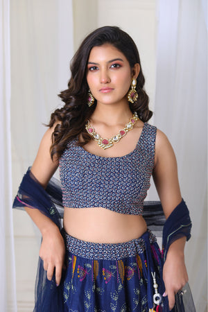 Navy Blue Silk Lehenga paired with a matching blouse and a lightweight Net Dupatta. This stunning set showcases intricate Hand-Embroidered details. Set includes a silk blouse, silk skirt, and a net dupatta. Perfect for standing out at your next special event.