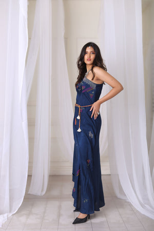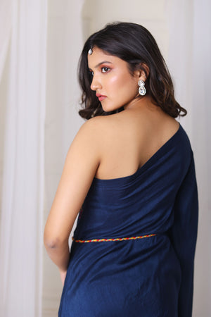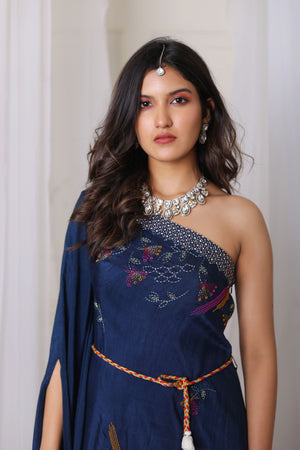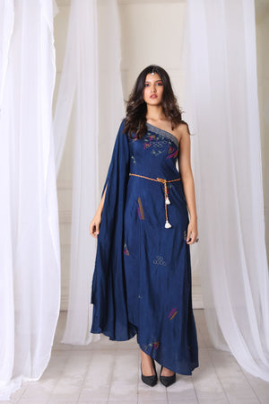 Add a sophisticated touch to your wardrobe with this one-shoulder silk dress in a rich navy blue shade. Featuring exquisite hand embroidery, this dress beautifully blends contemporary design with traditional craftsmanship. Ideal for evening parties, weddings, or any special occasion, it is a versatile and stylish addition to your collection. The flowing silhouette and luxurious silk fabric provide both comfort and charm.