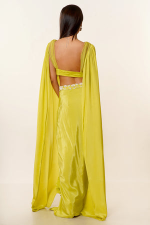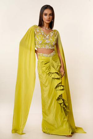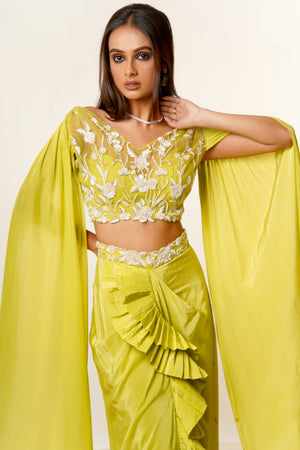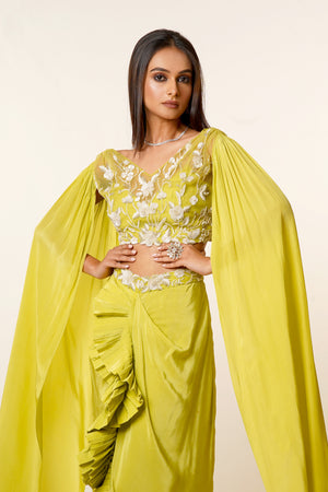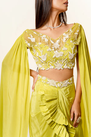 Lime Green Hand Embroidered Net Blouse with Long Sleeves