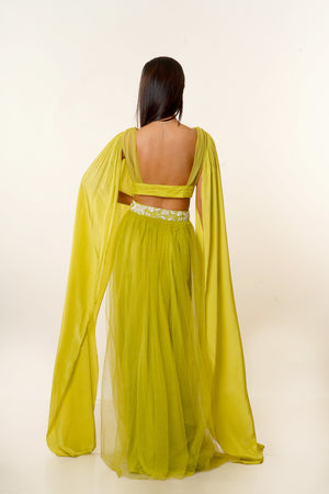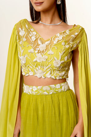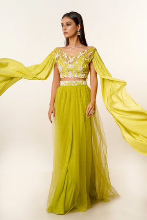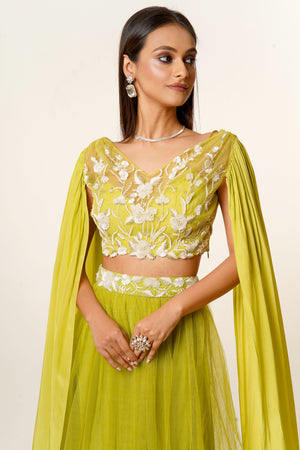 Striking Lime Green Hand Embroidered Net Blouse With Long Sleeves Paired With a Matching Net Skirt