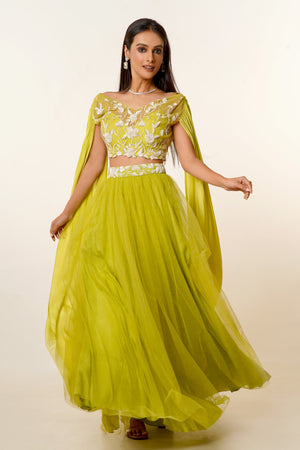 Home Striking Lime Green Hand Embroidered Net Blouse With Long Sleeves Paired With a Matching Net Skirt
